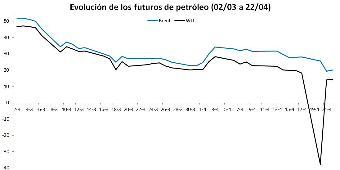 Esto ocurre especialmente en Estados Unidos, que sigue extrayendo demasiado, por eso el futuro del West Texas (WTI), mientras que el Brent (Europa) ha caído pero no ha perdido el nivel de 0 euros. Como el transporte y almacenamiento tiene un coste, el precio de los futuros lo recogieron y, dicho de otra forma, los vendedores pagaron por deshacerse de los barriles y “ahorrarse” este gasto.